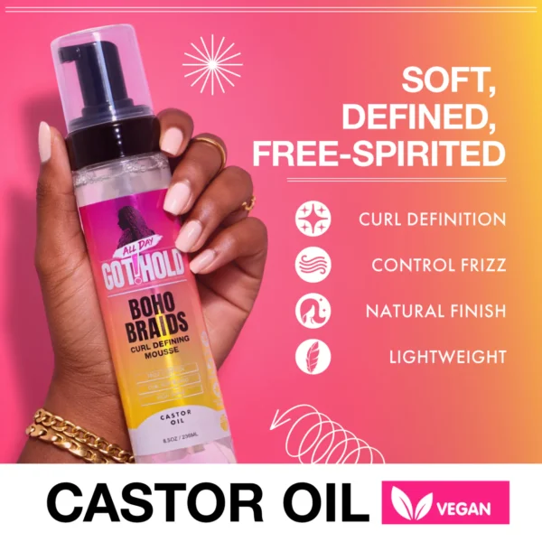 The ALL DAY GOT HOLD Boho Braids Curl Defining Mousse is crafted to enhance and refresh curl definition in boho braid styles without stiffness or heavy buildup.
