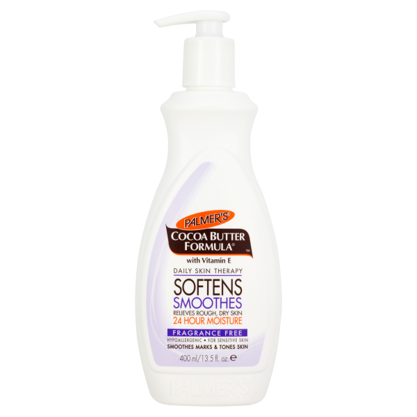 Palmer’s Cocoa Butter Formula Fragrance Free Body Lotion, made with pure Cocoa Butter, enriched with Vitamin E, in a soothing fragrance-free base, heals and softens rough, dry skin, smoothes marks and tones skin.  It is an excellent all-over-the-body moisturizer and after tanning butter.